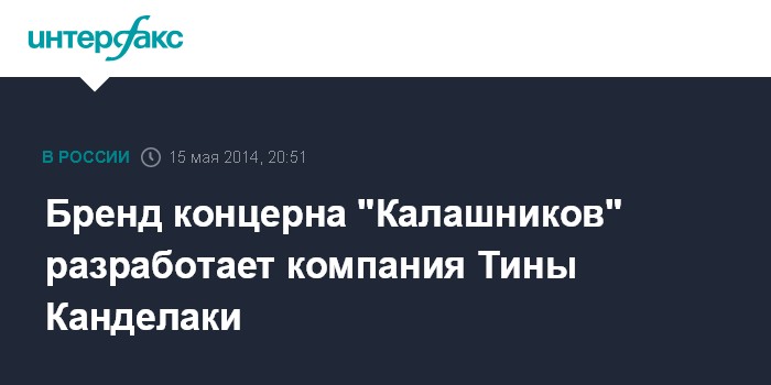 Москва. 15 мая. INTERFAX.RU - Победителем тендера на разработку бренда продукции оружейного концерна "Калашников" стала компания "Апостол" телеведущей Тины Канделаки, сообщает пресс-служба концерна в четверг.