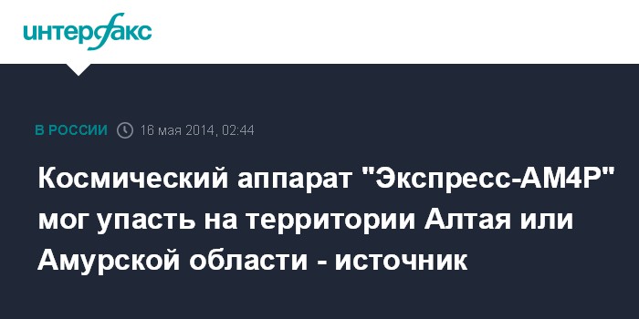 Москва. 16 мая. INTERFAX.RU - Запущенный с Байконура в ночь на пятницу космический аппарат связи "Экспресс-АМ4Р" мог упасть на территории Алтая или Амурской области, сообщил "Интерфаксу-АВН" источник в ракетно-космической отрасли.