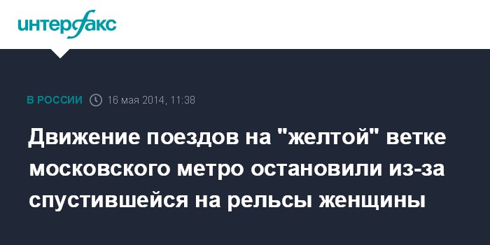 Москва. 16 мая. INTERFAX.RU - Женщина, спустившаяся на рельсы метро на станции "Шоссе Энтузиастов" и отказавшаяся подниматься обратно на платформу, стала причиной перебоев в движении на "желтой" ветке столичной подземки, сообщили "Интерфаксу" в пятницу в пресс-службе ГУ МВД РФ по Москве. По его словам, из-за ее действий произошли перебои в движении поездов.