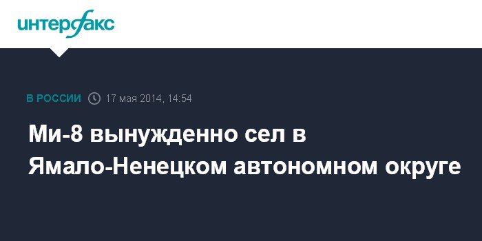 Москва. 17 мая. INTERFAX.RU - Вертолет Ми-8 совершил вынужденную посадку в Ямало-Ненецком автономном округе, сообщает пресс-служба Управления на транспорте МВД России по Уральскому федеральному округу. "Сегодня утром, в 12:08 местного времени, в 134 километрах от города Новый Уренгой (Ямало-Ненецкий автономный округ) из-за неполадок в энергетике совершил вынужденную посадку вертолет Ми-8", - говорится на сайте ведомства.