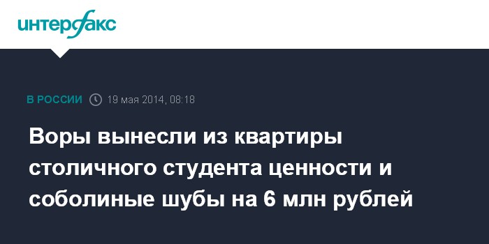 Москва. 19 мая. INTERFAX.RU - Квартиру студента на северо-западе столицы обокрали на 6 млн рублей, сообщили "Интерфаксу" в пресс-службе ГУ МВД России по Москве.
