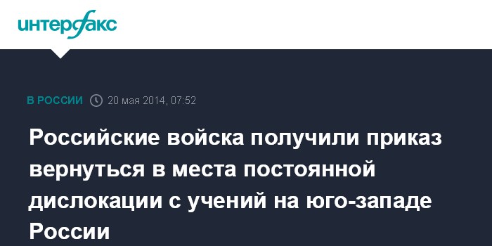 Москва. 20 мая. INTERFAX.RU - Министр обороны Сергей Шойгу отдал приказ воинским частям и подразделениям Вооруженных сил России, выполнявшим комплекс плановых мероприятий боевой учебы на полигонах Ростовской, Белгороской, Брянской областей, вернуться в пункты постоянной дислокации. Об этом сообщает управление пресс-службы и информации Минобороны РФ.