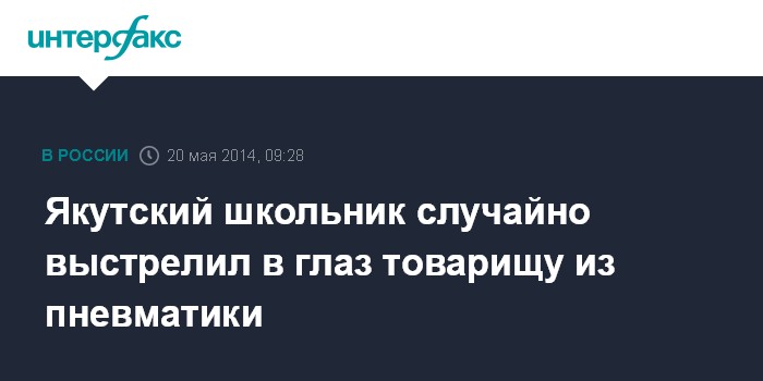 Москва. 20 мая. INTERFAX.RU - Девятиклассник из села Бютейдях в Якутии на уроке случайно выстрелил из пневматического оружия в глаз своему однокласснику.