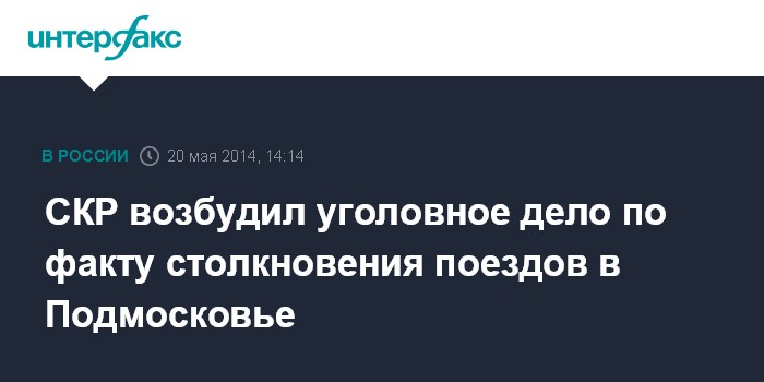 Москва. 20 мая. INTERFAX.RU - В Московской области возбуждено уголовное дело по факту столкновения двух поездов, сообщил официальный представитель СКР Владимир Маркин.