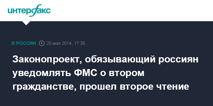 Москва. 20 мая. INTERFAX.RU - Госдума во вторник одобрила во втором чтении законопроект, обязывающий граждан РФ уведомлять о наличии второго гражданства или вида на жительство в другом государстве.