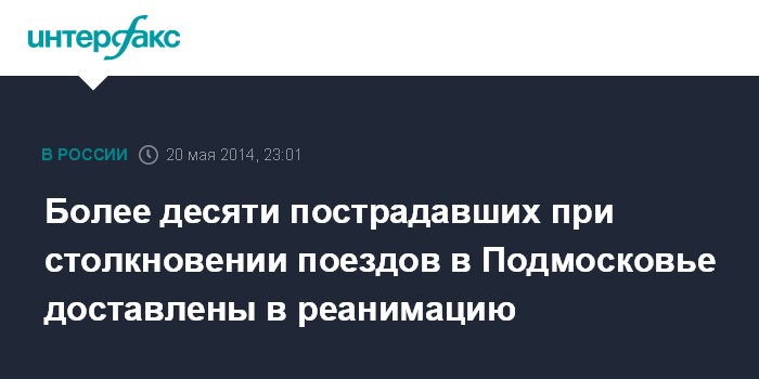 Москва. 20 мая. INTERFAX.RU - Все взрослые пострадавшие при столкновении поездов под Наро-Фоминском, доставленные в московские больницы, находятся в реанимации, сообщил "Интерфаксу" во вторник источник в экстренных службах города.