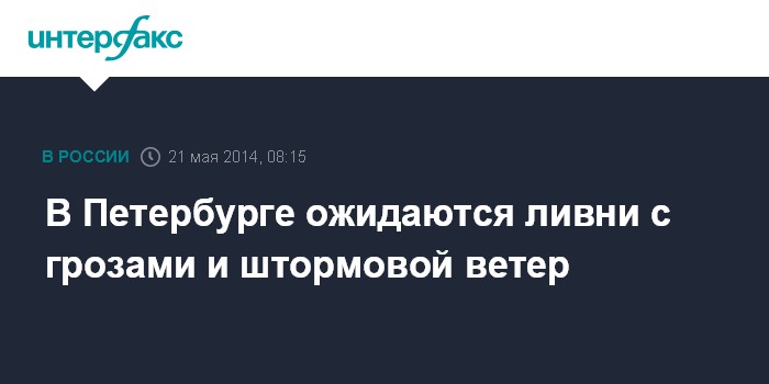 Москва. 21 мая. INTERFAX.RU - В Санкт-Петербурге в среду и четверг, по прогнозу синоптиков, ожидаются ливневые дожди, грозы с кратковременным усилением ветра до 15-20 м/с, в среду местами возможно усиление ветра до 23 м/с.