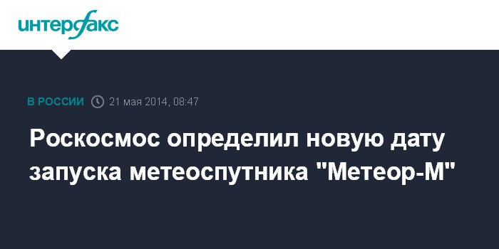 Москва. 21 мая. INTERFAX.RU - Роскосмос назначил новую дату запуска метеорологического спутника "Метеор-М" №2 совместно с партией иностранных малых космических аппаратов на 28 июня, сообщает пресс-служба Роскосмоса.