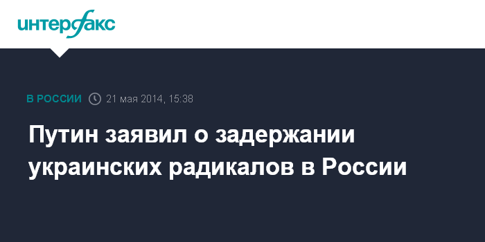 Москва. 21 мая. INTERFAX.RU - Президент России Владимир Путин заявил о задержании в России членов украинских праворадикальных групп. При этом он не уточнил, сколько человек и из каких именно группировок были задержаны.
