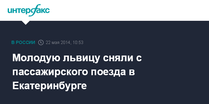 Москва. 22 мая. INTERFAX.RU - Транспортные полицейские в ночь на четверг сняли с поезда на станции "Екатеринбург-пассажирский" молодую львицу, которую перевозили в купе из Москвы в Новый Уренгой, сообщили "Интерфаксу" в пресс-службе Уральского управления на транспорте МВД РФ.