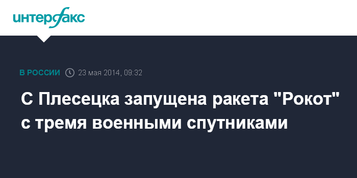 Москва. 23 мая. INTERFAX.RU - Ракета-носитель "Рокот" с тремя военными спутниками стартовала в 09:27 по Москве в пятницу с космодрома Плесецк, сообщил "Интерфаксу" по телефону официальный представитель управления пресс-службы и информации Минобороны по Войскам воздушно-космической обороны полковник Алексей Золотухин.