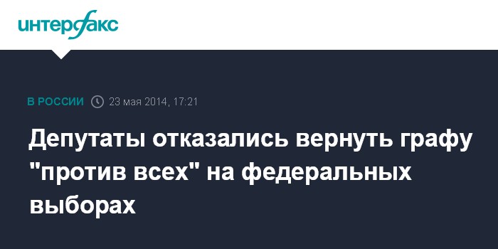 Москва. 23 мая. INTERFAX.RU - Госдума в пятницу одобрила во втором и третьем чтениях законопроект, предлагающий вернуть графу "против всех" в бюллетени на выборах в органы местного самоуправления. Поправку о внесении этой графы в бюллетени на федеральных выборах депутаты отклонили.