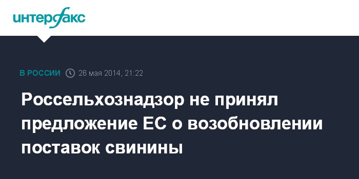 Москва. 26 мая. INTERFAX.RU - Россельхознадзор не принял предложение ЕС о возобновлении поставок свиней и свинины из Европы в Россию, озвученное в ходе встречи с представителями генерального директората по здравоохранению и защите потребителей Евросоюза (DG SANCO). Встреча состоялась в понедельник в рамах 82-й генеральной сессии Международного эпизоотического бюро (МЭБ) в Париже.