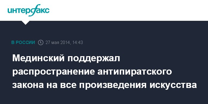 Москва. 27 мая. INTERFAX.RU - Рабочая группа разработала поправки к вступившему в силу антипиратскому закону и предлагает использовать законопроект, внесенный в Думу, который предусматривает распространить действие принятого и вступившего в силу закона о защите фильмов на все объекты авторских и смежных прав, заявил министр культуры Владимир Мединский.