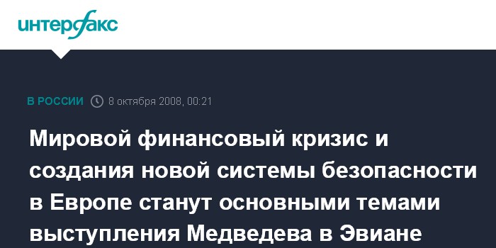 Мировой финансовый кризис и создания новой системы безопасности в Европе станут основными темами выступления Медведева в Эвиане