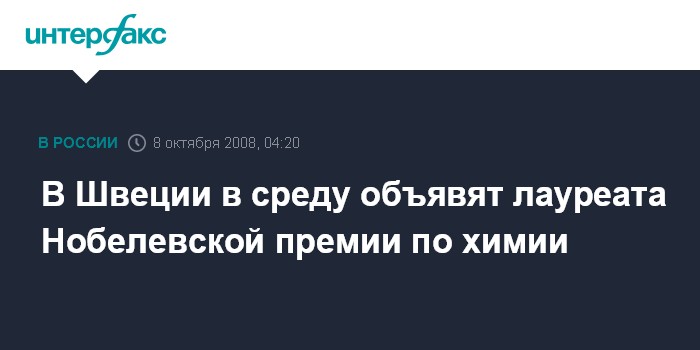 Стокгольм. 8 октября. ИНТЕРФАКС - Лауреата Нобелевской премии 2008 года по химии объявят в среду в столице Швеции Стокгольме.