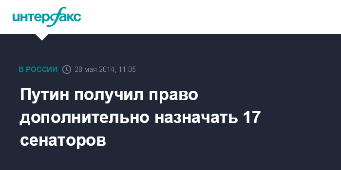 Москва. 28 мая. INTERFAX.RU - Совет Федерации вслед за Госдумой одобрил закон, которым президенту России предоставлено право назначать 17 дополнительных членов Совета Федерации.