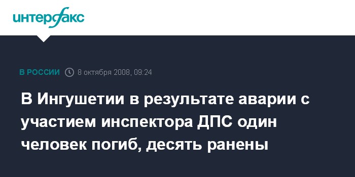 По его словам, авария произошла во вторник в Малгобекском районе на перекрестке дорог возле населенного пункта Нижние Ачалуки. "Водитель "Жигулей", нарушив правила дорожного движения, столкнулся с автомашиной под управлением инспектора ДПС, после чего произошло столкновение еще с двумя машинами. В результате водитель одной из машин скончался на месте, еще десять человек, в том числе трое детей госпитализированы с различными травмами", - сказал собеседник агентства.