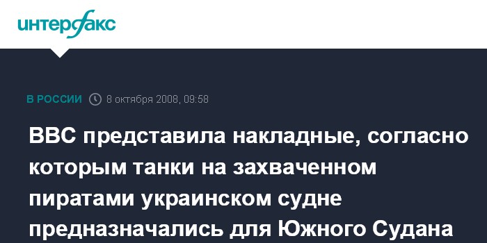 Москва. 8 октября. INTERFAX.RU - Британская телерадиокорпорация DDC в среду распространила свидетельство того, что танки, находящиеся на захваченном сомалийскими пиратами судне "Фаина", предназначались для Южного Судана. Она распространила накладную, в которой содержится информация о том, что контракт на поставку танков был заключен Кенией от имени правительства Южного Судана.