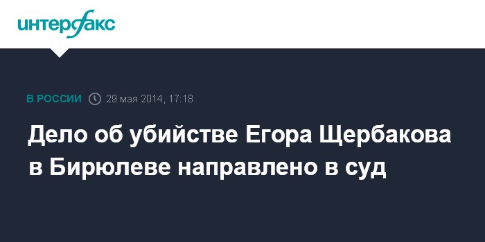 Москва. 29 мая. INTERFAX.RU - Уголовное дело в отношении Орхана Зейналова, обвиняемого в убийстве жителя Москвы Егора Щербакова, которое вызвало в прошлом году массовые волнения в столичном районе Бирюлево Западное, передано в суд. Об этом сообщил официальный представитель СК РФ Владимир Маркин.