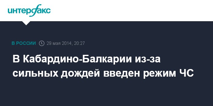 Москва. 29 мая. INTERFAX.RU - На всей территории республики Кабардино-Балкария введен режим чрезвычайной ситуации в связи с проливными дождями, сообщили в пресс-службе врио главы и правительства КБР.