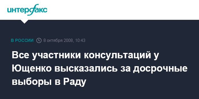 Москва. 8 октября. INTERFAX.RU - Лидеры фракций Верховной Рады поддержали проведение досрочных парламентских выборов, сообщила пресс-секретарь президента Украины Ирина Ванникова.