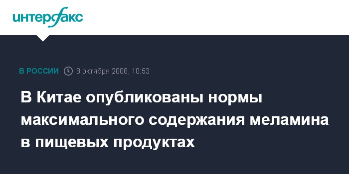 Москва. 8 октября. INTERFAX.RU - Министерство здравоохранения КНР совместно с рядом других ведомств разработали положения о максимально разрешенном содержании меламина в пищевых продуктах, сообщили в среду местные СМИ.