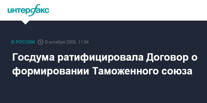 Москва. 8 октября. INTERFAX.RU - Госдума на пленарном заседании в среду ратифицировала Договор о создании единой таможенной территории и формировании Таможенного союза.