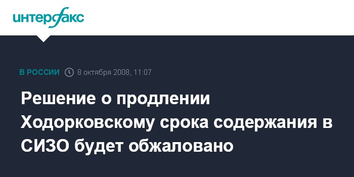 Москва. 8 октября. INTERFAX.RU - Адвокаты намерены обжаловать решение Читинского областного суда, продлившего до 2 февраля 2009 г. экс-главе НК "ЮКОС" Михаилу Ходорковскому срок содержания под стражей в читинском СИЗО.