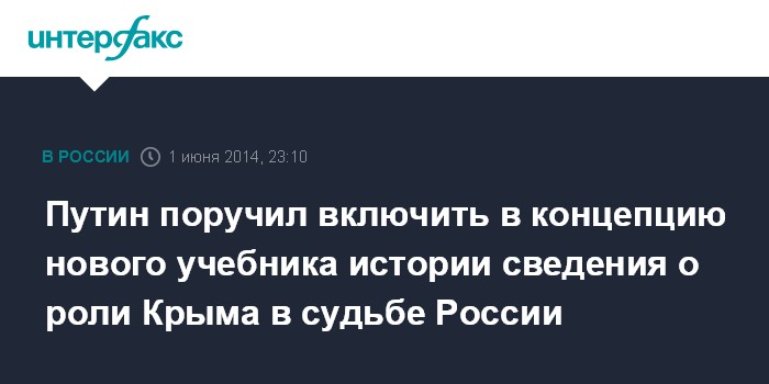 Москва. 1 июня. INTERFAX.RU - Президент России Владимир Путин поручил включить в концепцию нового учебника истории сведения о роли Крыма и Севастополя в судьбе Российской империи, СССР и современной России.