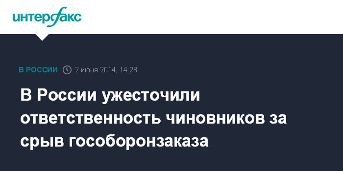 Москва. 2 июня. INTERFAX.RU - Премьер-министр России Дмитрий Медведев подписал постановление об ужесточении ответственности чиновников за срыв государственного оборонного заказа.