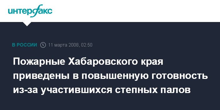 Хабаровск. 11 марта. ИНТЕРФАКС-ДАЛЬНИЙ ВОСТОК - В Хабаровском крае подразделения Федеральной пожарной службы МЧС РФ приведены в готовность номер один из-за большого количества степных палов, дым от которых заволакивает города и села.