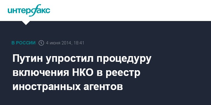 Москва. 4 июня. INTERFAX.RU - Президент Владимир Путин подписал закон, упрощающий процедуру включения некоммерческих организаций в реестр иностранных агентов. Закон дает Минюсту полномочия на включение НКО в реестр, даже если сама организация не подала заявления об этом.
