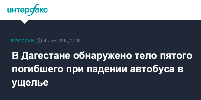 Москва. 4 июня. INTERFAX.RU - Тело пятого погибшего в результате падения в пропасть микроавтобуса обнаружено в Дагестане, сообщили "Интерфаксу" в среду в пресс-службе МВД по республике.