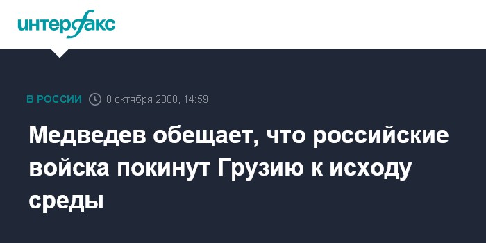 Эвиан. 8 октября. INTERFAX.RU - Президент России Дмитрий Медведев заявляет, что к исходу среды будет завершен вывод российских войск из зон безопасности у границ Южной Осетии и Абхазии.