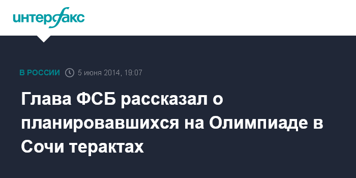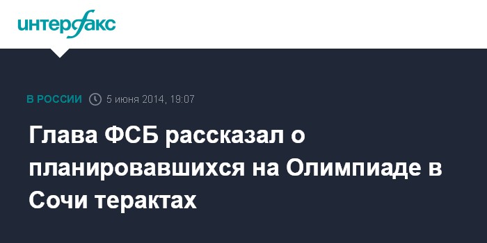 Москва. 5 июня. INTERFAX.RU - Директор ФСБ России Александр Бортников сообщил, что на Олимпиаде в Сочи планировались несколько терактов. По его словам, террористические атаки удалось предотвратить "совместно с коллегами из ряда стран".