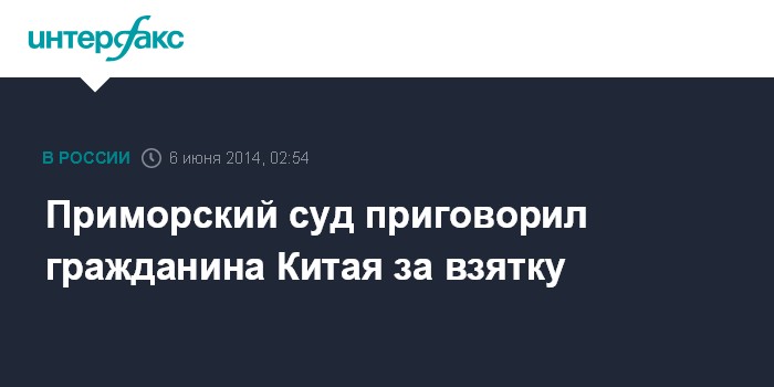 Москва. 6 июня. INTERFAX.RU - Суд в Приморье приговорил гражданина Китая, который дал взятку сотруднику миграционной службы, к пяти годам лишения свободы и штрафу в 12 миллионов рублей, сообщила в пятницу "Интерфаксу" старший помощник руководителя СУ СКР по Приморью Аврора Римская.