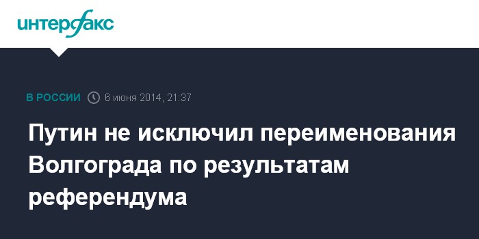 Москва. 6 июня. INTERFAX.RU - Президент РФ Владимир Путин заявил, что вопрос переименования Волгограда в Сталинград должен решаться жителями города на референдуме.