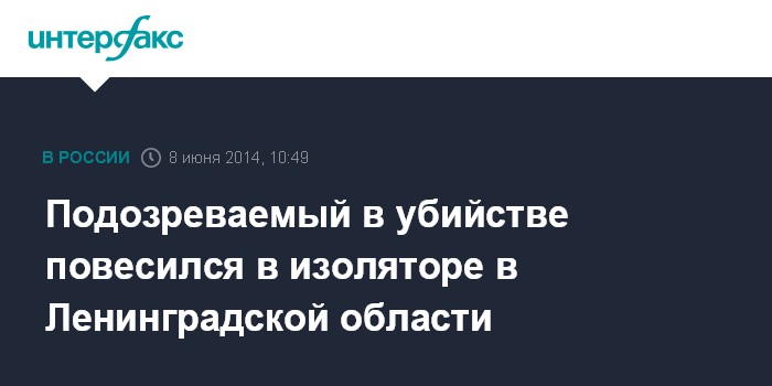 Москва. 8 июня. INTERFAX.RU - Мужчина, арестованный по подозрению в убийстве, повесился в камере изолятора временного содержания в Ленинградской области, сообщили "Интерфаксу" в пресс-центре МВД РФ.