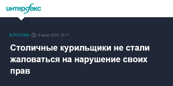 Москва. 9 июня. INTERFAX.RU - Массового потока жалоб в Москве на нарушение прав курильщиков нет, заявил "Интерфаксу" в понедельник уполномоченный по правам человека в столице Александр Музыкантский. По его словам, на сегодняшний день вообще не поступило ни одного обращения.