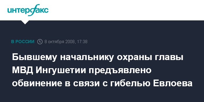 Москва. 8 октября. INTERFAX.RU - Бывшему начальнику охраны министра внутренних дел Ингушетии предъявлено обвинение в "причинении смерти по неосторожности" главе сайта "Ингушетия.ру" Магомеду Евлоеву, сообщил адвокат семьи Евлоевых Калой Ахильгов.