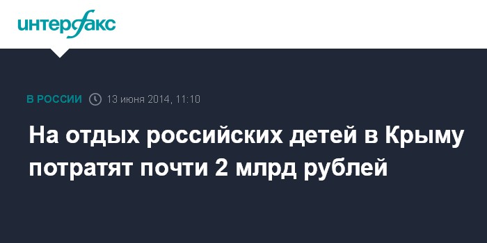Москва. 13 июня. INTERFAX.RU - Около 110 тыс. детей отдохнут в здравницах Крыма этим летом, правительство России выделило на это почти 2 млрд рублей, сообщила вице-премьер России Ольга Голодец. "Мы запланировали, что 110 тыс. детей отдохнут в этом году в здравницах Крыма", - сказала Голодец журналистам в пятницу в детском лагере "Жемчужный берег" в поселке Гурзуф на южном берегу полуострова.