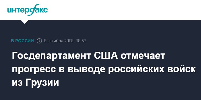 Москва. 9 октября. INTERFAX.RU - Выступая на брифинге в среду в Госдепартаменте, его официальный представитель Шон Маккормак отметил вывод российских войск из Грузии.