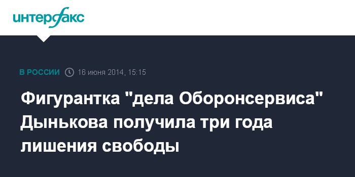 Москва. 16 июня. INTERFAX.RU - Замоскворецкий суд Москвы приговорил к трем годам лишения свободы фигурантку "дела Оборонсервиса", экс-главу центральной экспериментальной военно-картографической фабрики Минобороны Наталью Дынькову.