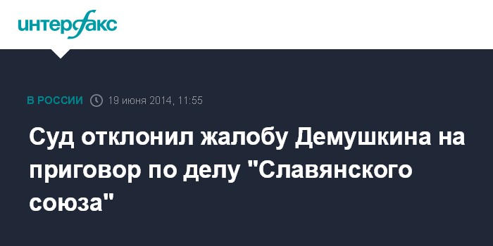 Москва. 19 июня. INTERFAX.RU - Останкинский суд Москвы отклонил жалобу лидера националистического объединения "Русские" Дмитрия Демушкина на приговор по делу о деятельности запрещенного "Славянского союза".
