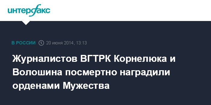 Москва. 20 июня. INTERFAX.RU - Погибшие на востоке Украины специальный корреспондент и видеоинженер ВГТРК Игорь Корнелюк и Антон Волошин посмертно награждены орденами Мужества, сообщил первый заместитель главы администрации президента РФ Алексей Громов.