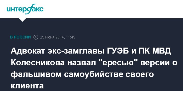 В среду в СМИ появилась публикация, в которой утверждалось, что самоубийство Колесникова могло быть инсценировано и якобы он попал в программу защиты свидетелей.