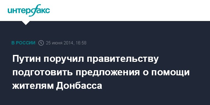 Москва. 25 июня. INTERFAX.RU - Президент РФ Владимир Путин поручил правительству подготовить меры помощи жителям Украины, находящимся в зоне конфликта и выезжающим в Россию.