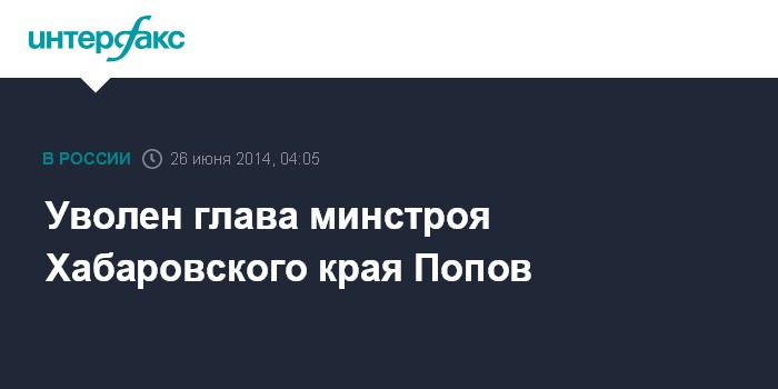 Москва. 26 июня. INTERFAX.RU - Губернатор Хабаровского края Вячеслав Шпорт подписал распоряжение об отставке министра строительства края Андрея Попова, сообщил в четверг официальный сайт правительства региона.
