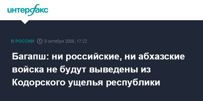 Москва. 9 октября. INTERFAX.RU – Президент Абхазии Сергей Багапш заявляет, что российские и абхазские войска останутся в Кодорском ущелье республики.